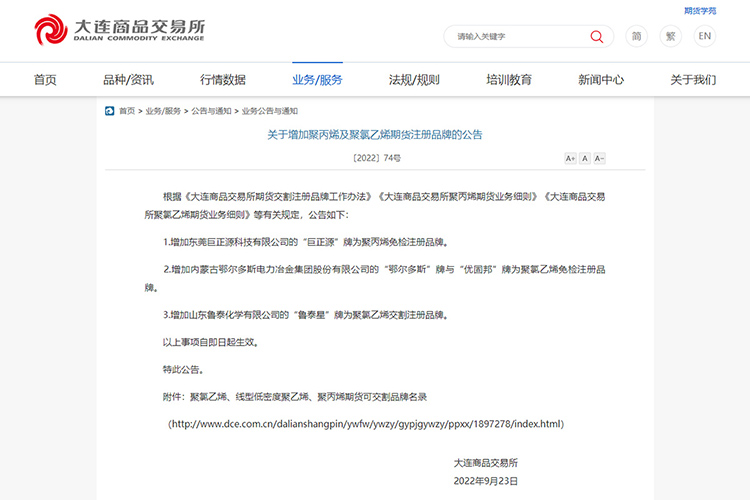 9月23日,大連商品交易所發(fā)布公告,增加東莞巨正源科技有限公司的“巨正源”牌為聚丙烯免檢注冊品牌。