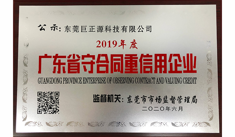 近日,經(jīng)東莞市市場(chǎng)監(jiān)督管理局審核批準(zhǔn),東莞巨正源科技有限公司獲得2019年度“廣東省守合同重信用企業(yè)”榮譽(yù)稱號(hào)。